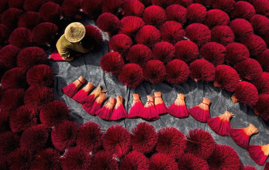 While visiting the village on a bright day, visitors may easily see the image of people drying incense. During this season, buildings, yards, and vacant fields are covered in dried clusters of red incense like enormous flowers. Tourists will feel more at ease and comfortable as they stroll around the hamlet because of the soft aroma of incense sticks that is following the breeze.
