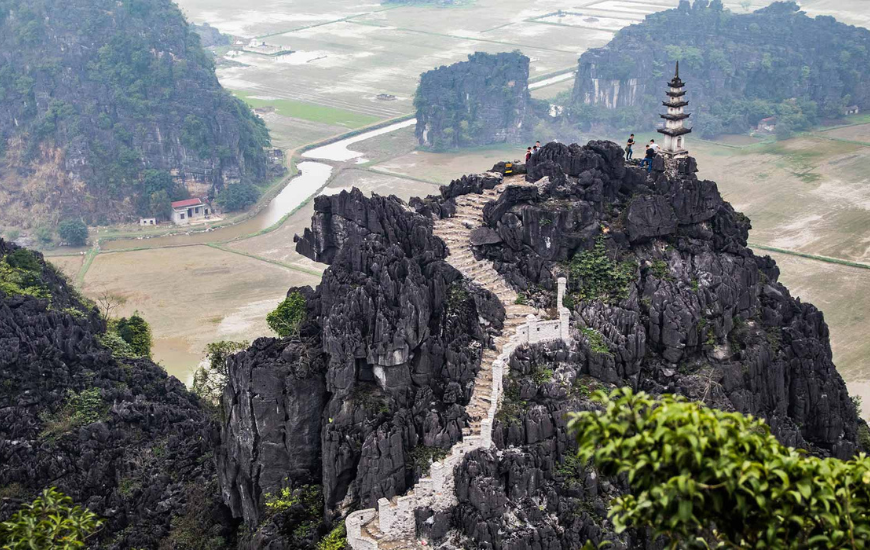 Our guide will pick you up at your hotel in the Old Quarter and straight to Ninh Binh to start your Hang Mua Peak Tam Coc One Day Tour. First location we arrive at is the foothills of Hang Mua Peak, known as “Lying Dragon Mountain”. To get to the top, you will have to climb 486 stone stairs (one of things you must do in Ninh Binh) and from there you will admire the verdant scenery of Ninh Binh on the way to the top. Once we reach the top, we will take some time to take pictures and see the natural beauty through the mountains, rice fields and winding river. At midday, you will have time to enjoy Ninh Binh traditional cuisine and take a rest.