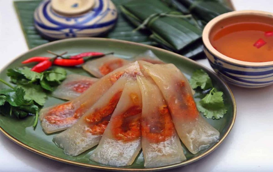 Bánh bột lọc is a Vietnamese dish of small, chewy tapioca dumplings filled with shrimp and pork belly, often topped with fried shallots and served with sweet chili fish sauce. Originating from Huế, the city was once the imperial capital of the Nguyễn dynasty. These dumplings are known for their simple yet sophisticated dishes, with a combination of flavorful meat morsels and a sweet fish sauce dipping sauce. They can be steamed or boiled and wrapped with or without a banana leaf, with the banana leaf wrapping being called bánh bột lọc lá, meaning "clear flour cake with leaf," and without the leaf, bánh bột lọc trần, meaning "clear flour cake bare."