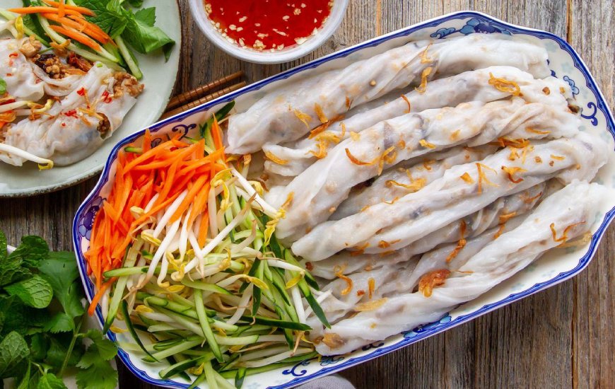Bánh cuốn is a paper-thin steamed rice flour pancake, similar to delicate sheets of fresh rice noodles. It is rolled with minced pork and mushrooms, piled on a plate, sprinkled with deep-fried shallots, cut into bite-sized sections, and topped with fresh herbs like cilantro or Vietnamese basil. Traditionally eaten as breakfast in Hanoi, it can now be enjoyed as a late-night snack. To eat, dip a section of rolled noodles into warm fish sauce broth, brightened with fresh lime, or add herbs to the dipping sauce. Bánh cuốn is often served with different sides of pork sausages, including orange-hued, roasted cinnamon sausage called chả quế.