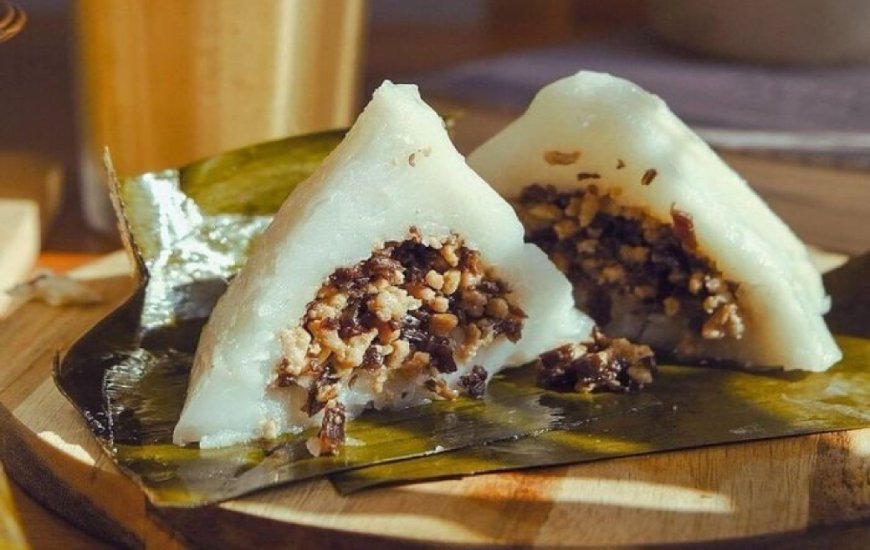 Banh Gio, a Vietnamese breakfast dish, is a banana-leaf-wrapped pyramid-shaped rice dumpling filled with ground pork, onions, minced wood-ear mushrooms, and quail eggs. The banana leaf wrapper imparts a tea-like aroma and a subtle green color when steamed. The batter for Banh Gio is a mixture of rice flour, tapioca starch, and a flavorful pork stock. The quality of the dish depends on the pork stock, which is essential for a delicious Banh Gio. The flour mixture is par-cooked on the stove to make it thick enough to spread on the banana leaf. Overcooking the mixture can result in clumping up. Banh Gio can be enjoyed plain, with soy sauce, or with a sweet and sour chili dipping sauce (Nuoc Mam Cham).